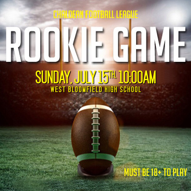 CFL Rookie game Sunday July 15th at West Bloomfield High at 10:00 AM. You have to tryout to play, no exceptions. Must be 18 and up. Chaldeanfootball.com. Just show up ready to run. No need to register. Be sure to be there at least 15 minutes early to stretch.
